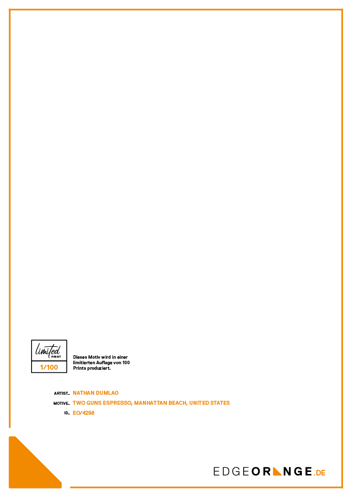 Front Rückseite Rückseite Limited Print-Label mit Produktionsnummer und Informationen zum Motiv und Künstler. Auf Wunsch mit persönlicher Widmung. Mehr erfahren Größen S – (29,7 x 42 cm) M – (42 x 59,4 cm) XL – (59,4 x 84,1 cm) EO/4298 Two Guns Espresso, Manhattan Beach, United States EUR 59.00 Noch 81/100 Prints verfügbar * Größe: -- Auswählen -- S (DIN A3 / 29,7 x 42 cm) M (DIN A2 / 42 x 59,4 cm) (+ EUR 20.00) XL (DIN A1 / 59,4 x 84,1 cm) (+ EUR 40.00) Montage: GAEKKO Galerie-Aufhängung (EUR 9.90) Rückseite: Mit persönlicher Widmung (EUR 14.90) Artikel wurde zum Warenkorb hinzugefügt Bestellung abschließen Kaffee, Tassen, Grün Ähnliche Produkte Ansehen